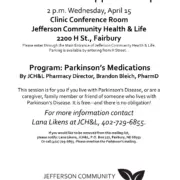 The Parkinson’s Support Group will meet on Wednesday, April 15, at 2 p.m. in the Jefferson Community Health & Life Clinic Conference Room. The program will be on Medications by Brandon Bleich, JCH&L Pharmacy Director.