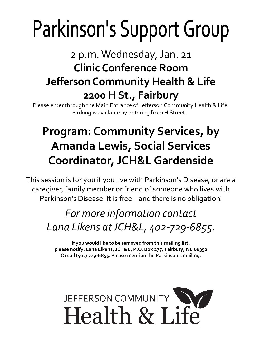 The Parkinson’s Support Group will meet on Wednesday, Jan. 21, at 2 p.m. in the Jefferson Community Health & Life Clinic Conference Room.